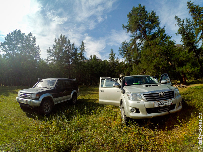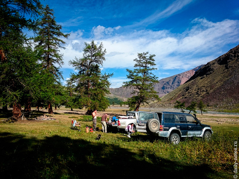 Когда мы приехали на поляну, один из местных сказал, что эта дорога была отсыпана ещё в советское время для лесовозов, но после землетрясения она была разрушена, и теперь он самостоятельно занимается её восстановлением. На данный момент частично восстановлен один участок, но по нему могут проехать только квадроциклы. Сами алтайцы передвигаются только по бродам на шишиге, и они были сильно удивлены нашему появлению на практически стоковых машинах.