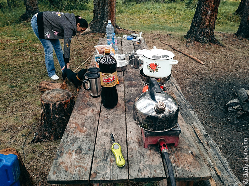 Можно взять с собой металлический чайник, потому что из кастрюли неудобно разливать воду по чашкам.