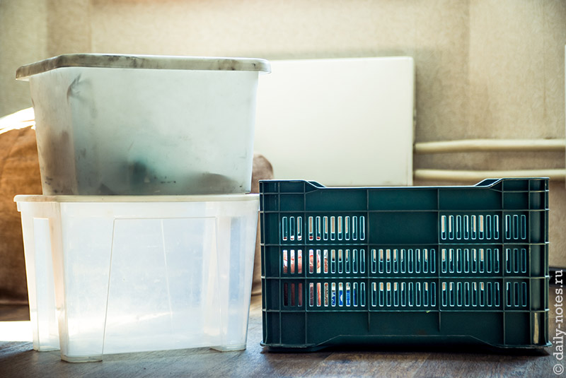 В своё время мы купили большие пластиковые ящики в Гиганте (сине-зеленый ящик справа) и в Икее (белый и прозрачный слева). У всех из них есть свои плюсы: