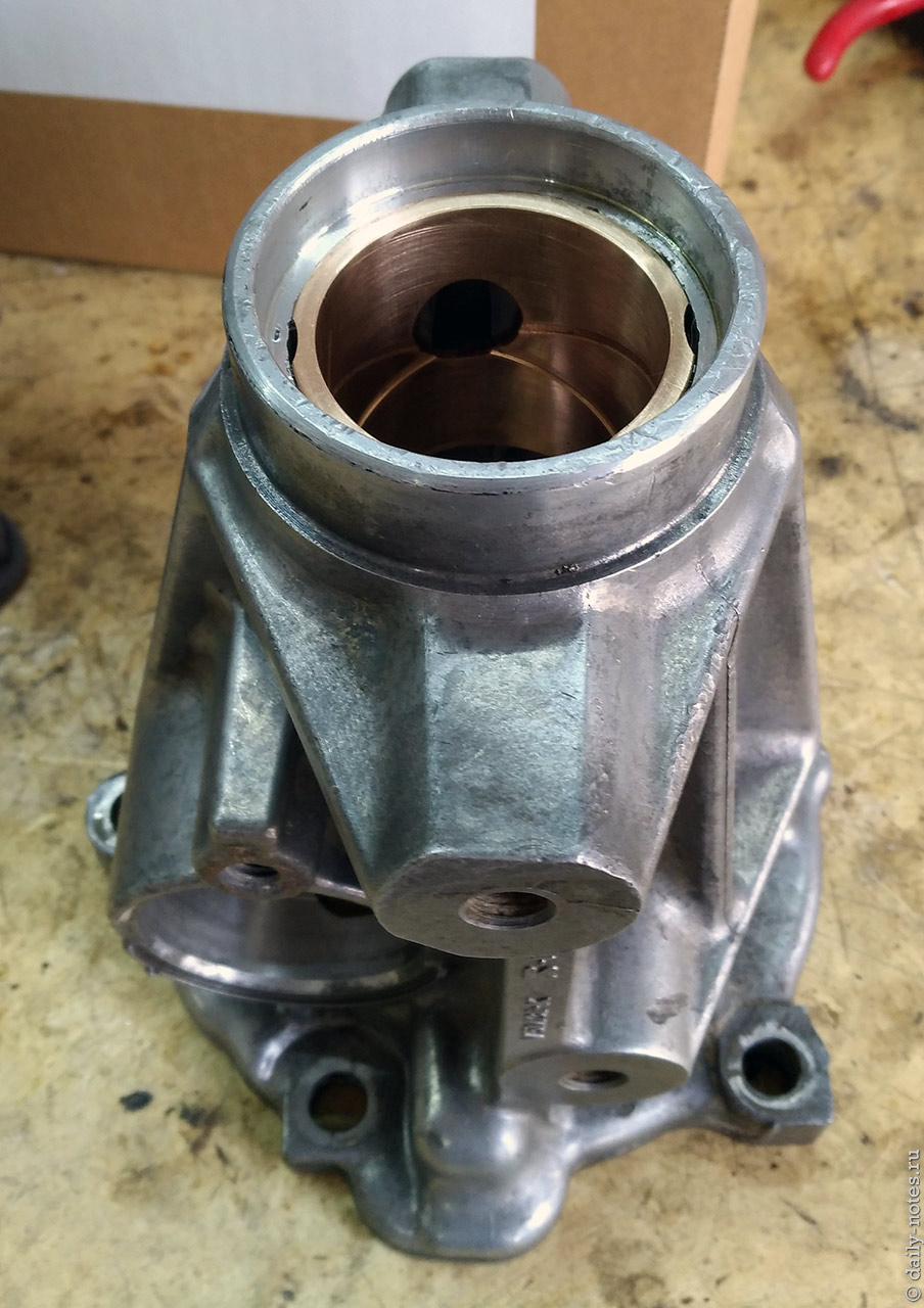 Связался с ним — ответил он не сразу, но работу выполнить согласился. Далее хвостовик был снят и отправлен с карданом в Екатеринбург (да, я не смог снять вилку, каюсь), где через 2 недели мне изготовили новый вкладыш. Пара фоток ниже